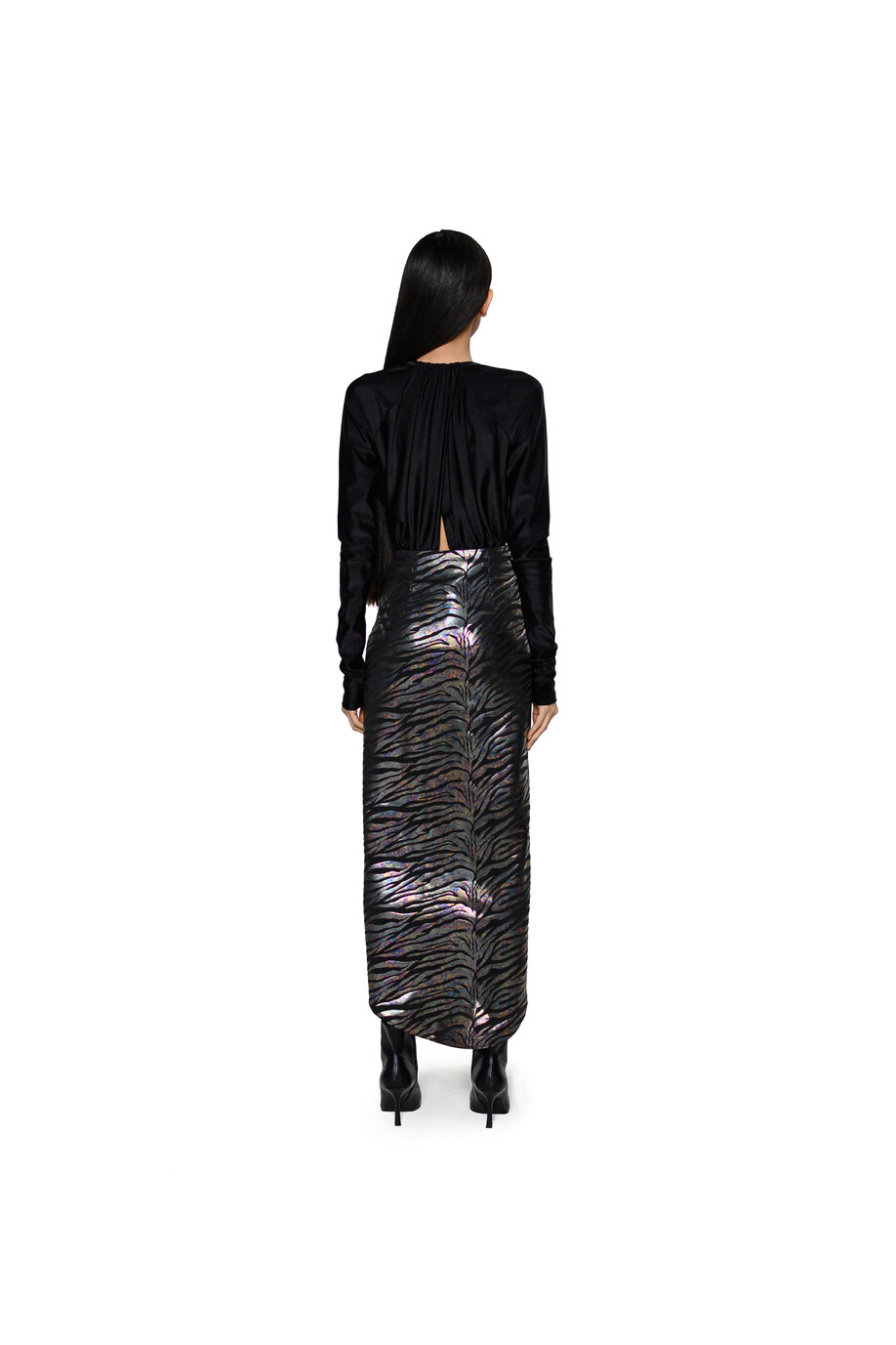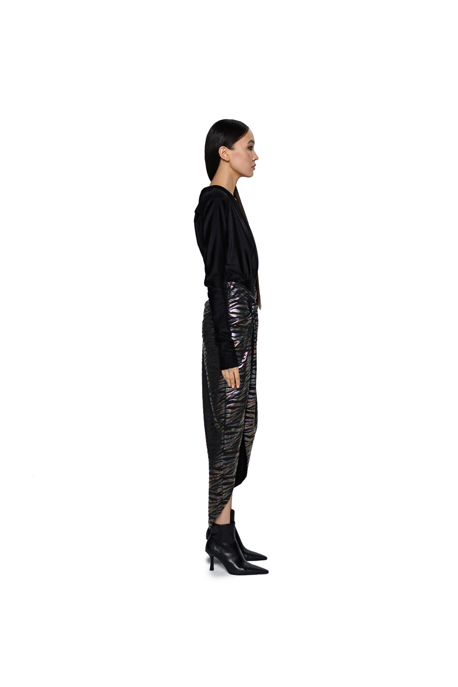 Юбка выполнена из трикотажного полотна с блестящим притом
