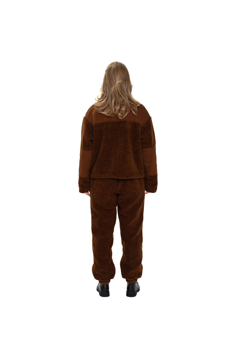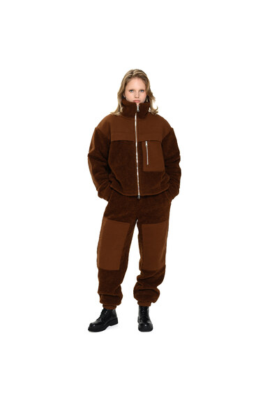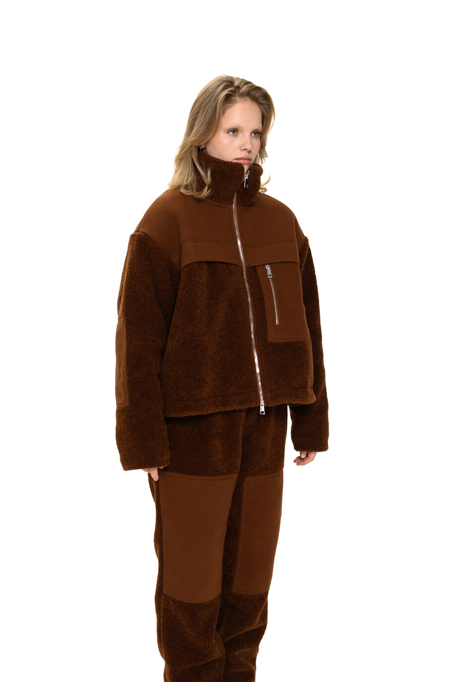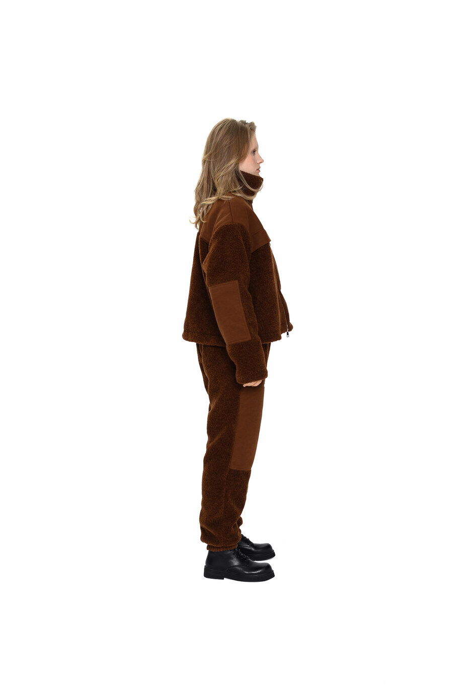 Костюм выполнен из экологического меха барашек и отделан пальтовой тканью